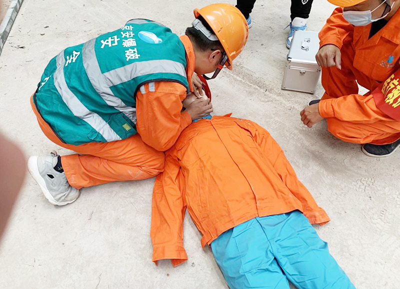 演练模拟了项目破碎车间一名作业人员在进行设备巡检时不慎从高处坠落。事故发生后,现场人员第一时间向应急救援小组报告,总指挥即刻启动应急救援预案,相关人员接到命令后立即开展救援,现场警戒组拉起安全警戒线,封锁事故现场,医疗救护组对伤员进行了简单的救治和包扎,通信组及时向附近医院联系救援,应急救援小组将伤员送到医疗救护车指定现场。随后,事故调查组对本次事故进行了详细的调查,总指挥确认现场秩序正常后,解除应急行动,宣布演练结束。