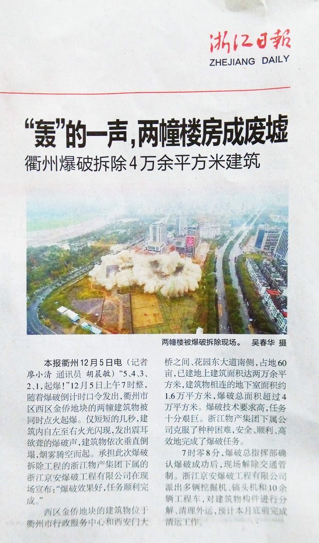 “5、4、3、2、1,起爆!”12月5日上午7时整,随着爆破倒计时口令发出,衢州市区西区金侨地块的两幢建筑物被同时点火起爆。仅短短的几秒,建筑内自南至北火光闪现,发出一阵阵连续清脆的爆破声,建筑物依次垂直倒塌,烟雾腾空而起。承担此次爆破拆除工程的浙江物产集团下属的ky平台下载在现场宣布:“爆破效果良好,任务顺利完成!”